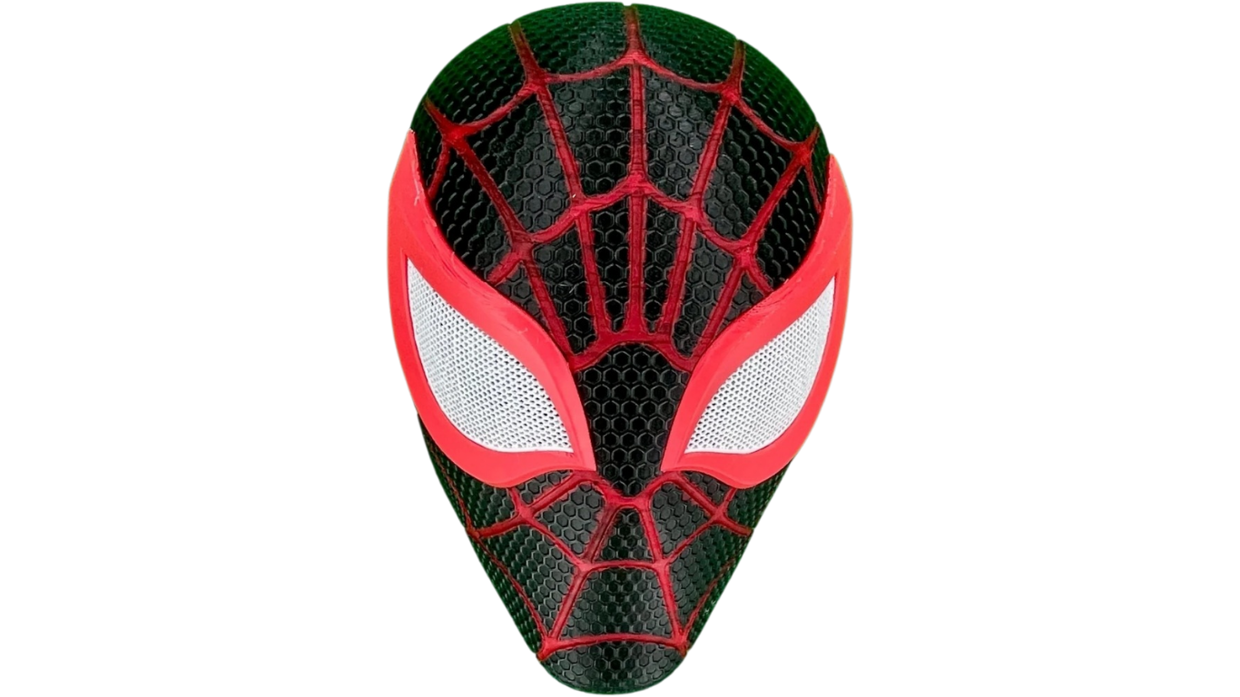 Capture the essence of Miles Morales with this wearable mask helmet. The design encapsulates all the iconic features of the Spiderman character, from the red and black color scheme to the detailed spider emblem. Stand out in the crowd and showcase your love for the Marvel Universe with this must-have accessory