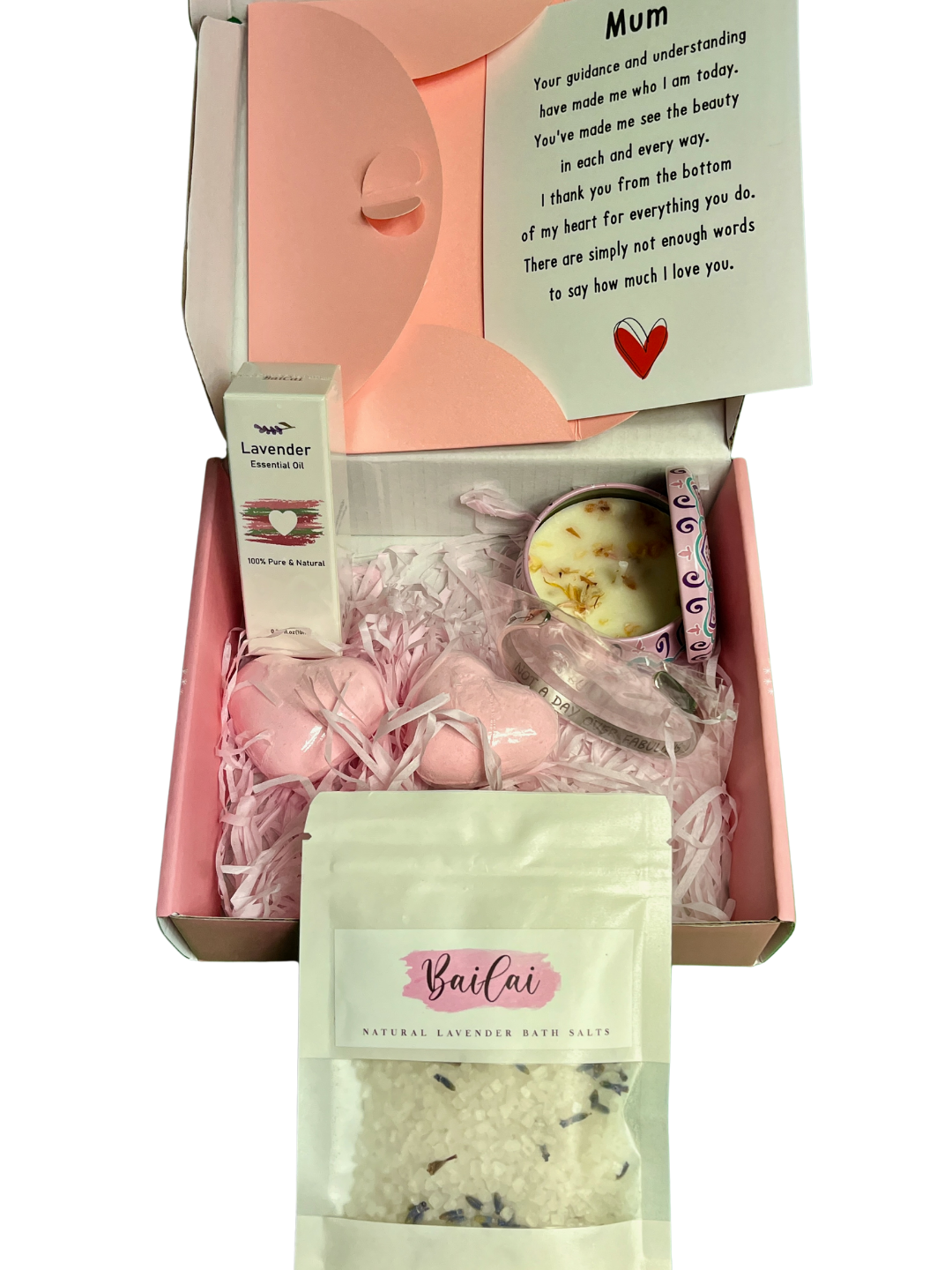 Each gift box contains 2 bath bombs, a candle, essential oil, bath salts, and a card, a keyring or bracelet with specially for you and good friend having a small zipper bag as well.ย