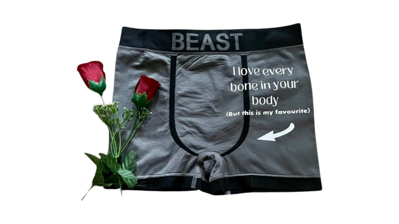 A fun, cheeky pair of men’s shorty style underpants, perfect for a valentines gift for your boyfriend or as a cotton anniversary gift for your husband.